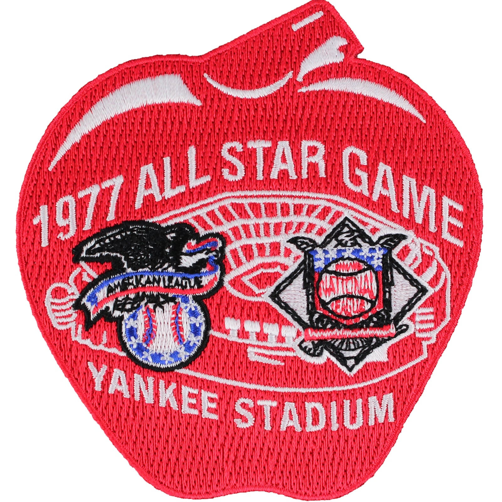 This is the patch for the 1977 MLB all-star game in New York. Designed for commemorative, nostalgic display, and collection. The patch measures approximately at 3.75" wide X 4" tall.